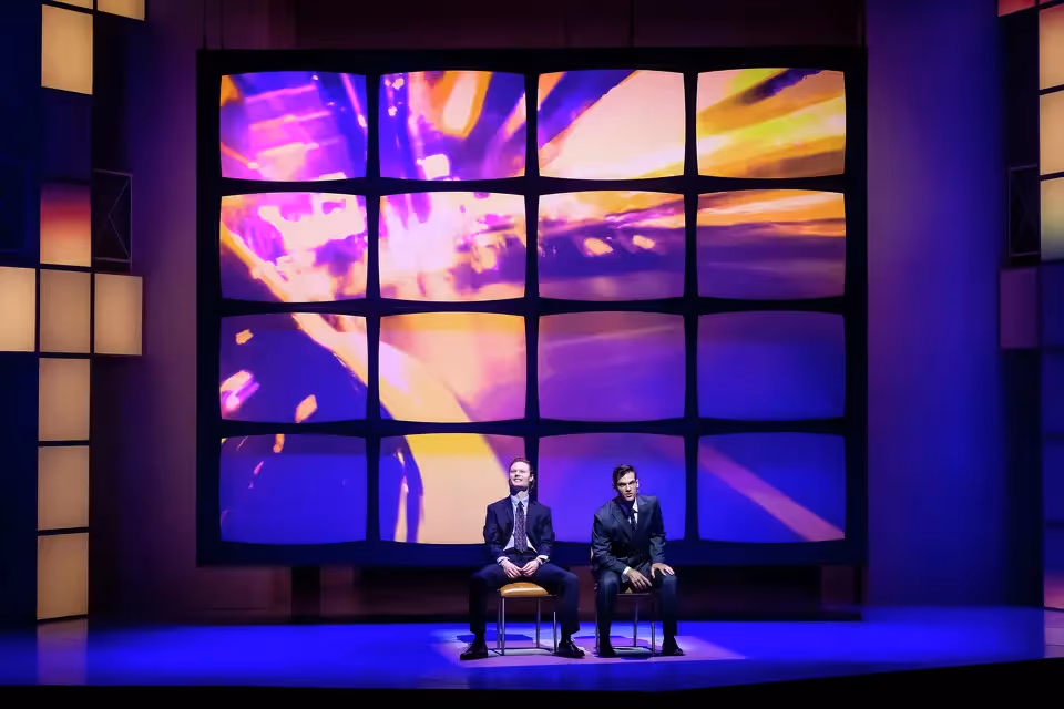 Timothy Mackabee's set is stunning, a geometric display of white blocks that mirror the show's sleek sterility. It feels like a doctor's office, a morgue and so many generic high-rises and corporate offices all at once. A wall of screens evoked the "Club MTV" set, the show where beautiful people danced to late-'80s music videos. It's complemented by Robert J. Aguilar's crisp lighting and Jason H. Thompson's nostalgic video projections.